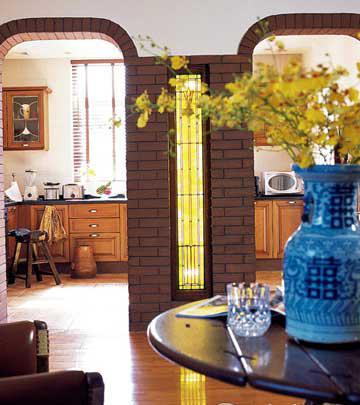 雙拱門與連接墻面的彩色玻璃,有效地將客廳與廚房分割開
