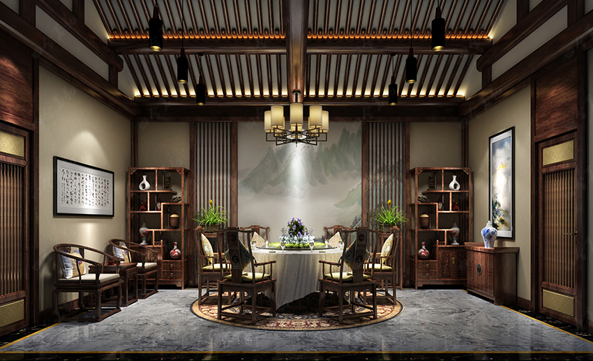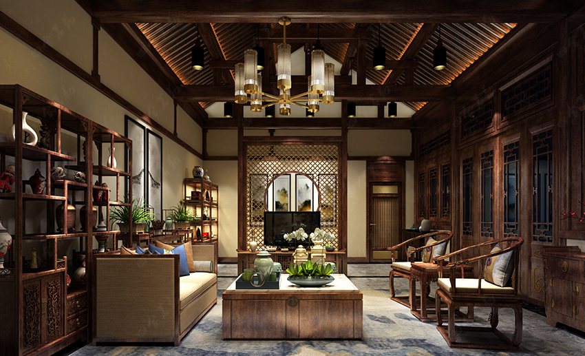 追尋往昔,我們不難發現,真正的生活應該和植物、山水、平和、文化結合在一起。設計師將這些概念寫入眾多裝飾元素:盆景、隔扇、山水畫、梁架、博古架、青瓷古玩,通過充滿匠心的布置合而為一,帶給人一種自然親切、古韻盎然的愜意體驗。