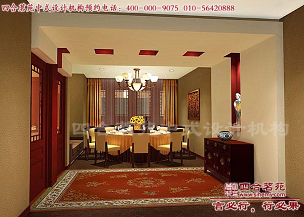 中式風格古樸而又莊重,擷取北京四合院“寬容”、“厚德”的文化內(nèi)涵。四合院大門典型的垂花門、院內(nèi)青磚影壁、朱紅圓柱、古建穹頂?shù)葻o不帶著京城傳統(tǒng)風味。宮燈流光溢彩,照亮畫意滿堂,使人如置身古代宮廷。庭院中再種些花草,養(yǎng)些魚鳥,無疑為古典四合院帶去了勃勃生機。